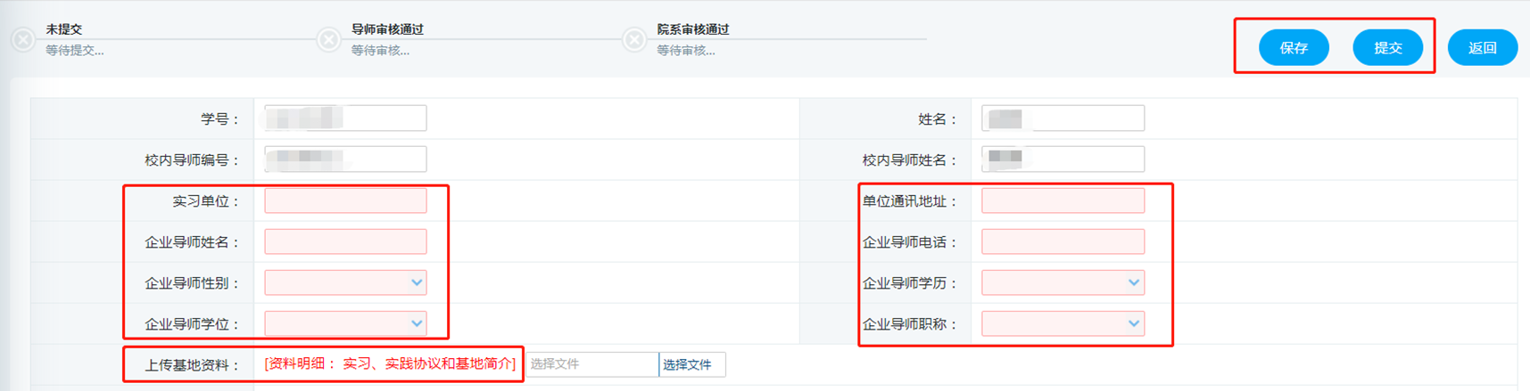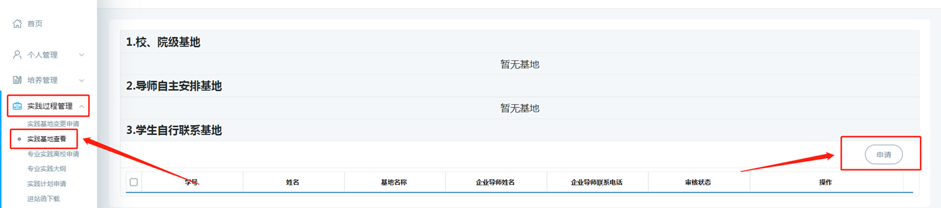 学生【实践过程管理】-【实践基地查看】进行申请,填写自行联系单位企业导师信息,上传实习实践的协议和基地简介等;