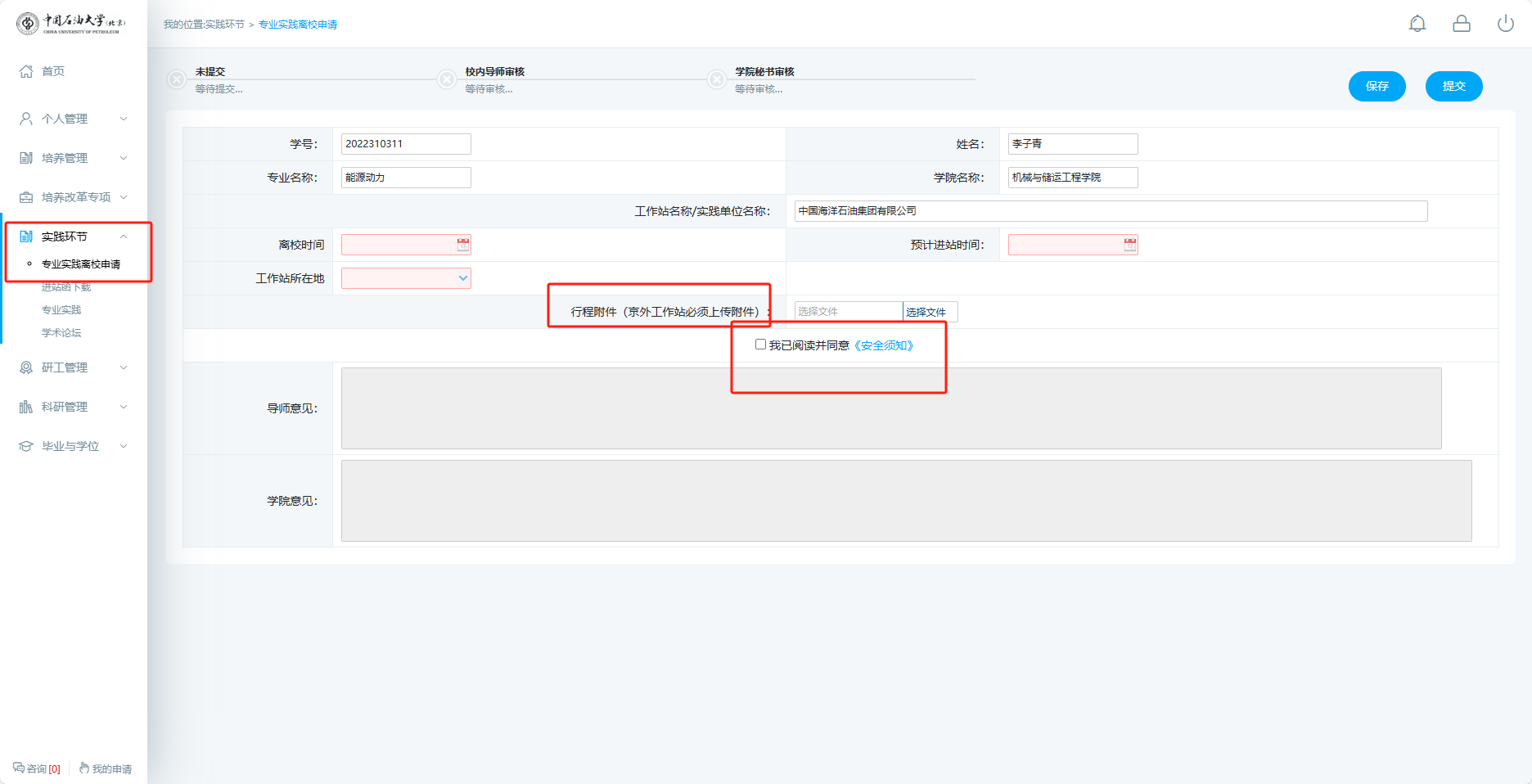 学生确定基地信息,同校企导师确认具备进站条件后,可在在研究生系统【实践过程管理】-【专业实践离校申请】中提交申请,经学校导师、学院教学秘书审核通过后,可以开展进站实践。