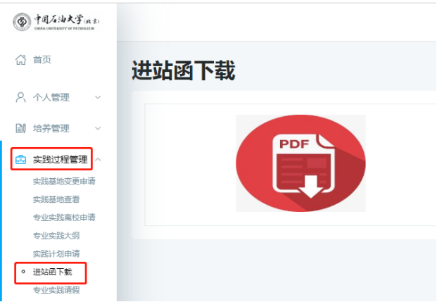 学院上传进站函之后,学生可在研究生管理系统中【实践过程管理】—【进站函下载】界面点击下载、持进站函前往基地。(仅限校级基地)