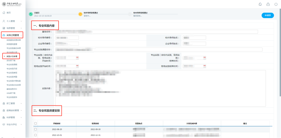 专业实践计划由学校导师与企业导师共同制订,学生在系统【实践过程管理】—【实践计划申请】中填写提交,由校外导师、校内导师审核。