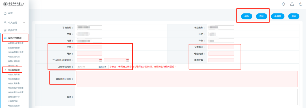 学生在系统【实践过程管理】—【专业实践请假】中填写提交,由校外导师→工作站管理人员→校内导师→学院主管研究生教学院长→研究生工作部(请假天数达一周以上)审核。