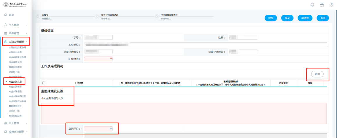 学生在系统中【实践过程管理】—【实专业实践月报】模块中填写提交,由校外导师、校内导师审核。